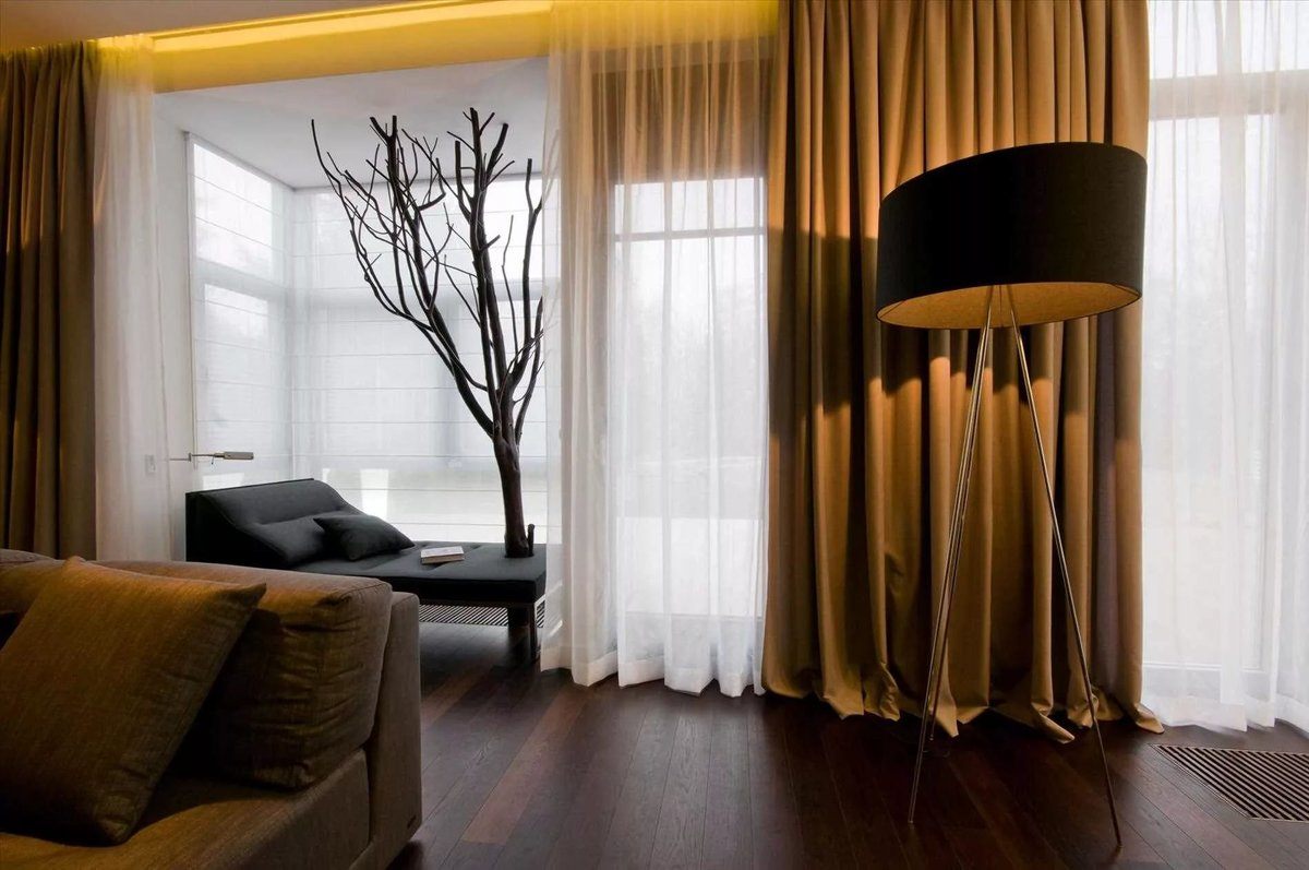 - Единство гаммы оттенков: тюль и штора светлые, но штора имеет более насыщенный цвет, как правило, теплее, чем тонкая занавесь (например, белый и золотой, голубой и синий, светло-бежевый и кремовый).