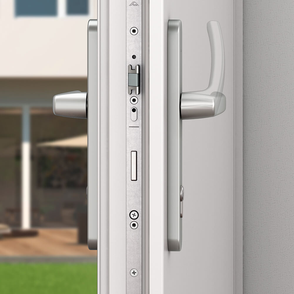 Для блокировки открытия створок производятся специальные накладные и врезные замки, ручки-заглушки (розетки), ручки-замки и завертки с фиксацией на ключ.