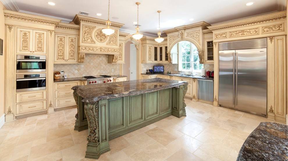 Зеленая кухня с островом в классическом стилеИсточник dd-space.com