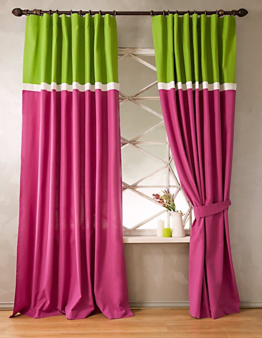 Создать необычную и яркую обстановку в стилях хай-тек, минимализм, поп-арт можно с помощью оригинальный комбинаций. Для этого салатовые или другие шторы дополняются красными, синими, фиолетовыми, сиреневыми, бордовыми, оранжевыми и другими деталями. Например, на кухне уместны оливковые занавески, которые легко дополнить оранжевым тюлем. При этом стоит учитывать подтон зелёного, то есть сочетать тёплые варианты только с такими же. В любом случае занавеси или портьеры легко дополнить любыми текстильными элементами обстановки.