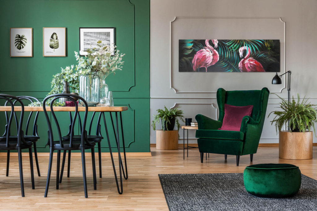 Изумрудно-зеленый в интерьере хорошо сочетается с голубым и розовым — в основном в его пастельных тонах, но если вам нравится экстравагантность, вы можете побаловаться небольшим количеством фуксии или бирюзы. Пудровый розовый привносит сладость, ассоциируется с нежностью и любовью и создает впечатление тепла и нежности.